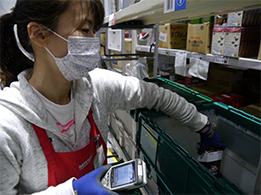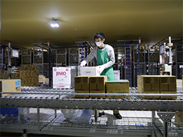 伊藤忠食品は、組織小売業向け専用物流センターの受託運営と、複数のお取引先様へ納品する汎用物流センターの運営を行っています。近年、物流業界での人手不足が深刻になっており、物流費の維持・低減に向けた物流システム構築のニーズが高まっており、当社では物流設備投資を通じた庫内作業自動化による「省人化」や、ピッキングシステムの開発、納品時の検品が不要となる仕組みの導入による「生産性の向上」を提案しています。また、業務改革による在庫指標の改善や、計画入荷の推進による入荷作業生産性の向上、1センターで取り扱う商品カテゴリーの拡大を通じた倉庫内作業の生産性・配送効率の向上を高める取り組み等により、生配販連携によるローコストオペレーションの追求を進めています。
