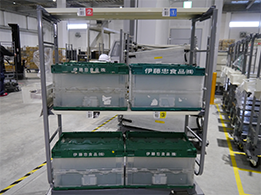 4店舗分を同時に作業できるピッキングカートが導入されていない倉庫では、店舗に納品する商品を1店舗分ずつオリコン(折りたたみコンテナ)へピッキングしていました。複数店舗分を同時に作業できる作業端末をシステム会社と共同開発したことで、生産性を高めています。