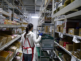 従来、倉庫内の作業は「人が商品を取りにいく」仕組みでしたが、商品を人がいるところへ運ぶ「定点ピッキングシステム」を構築し、省人化に取り組んでいます。また、入出荷の少ない商品については搬送から出荷までの全自動化を進めています。
