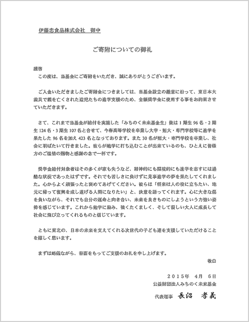 | 寄付先 | 公益財団法人みちのく未来基金(※) |