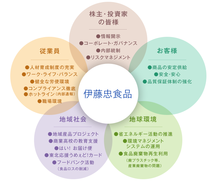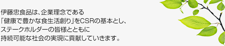 伊藤忠食品グループは、「常に時代の変化と要請を先取りし、健康で豊かな食生活創りを通じて消費者と社会に貢献します」という企業理念のもと、事業活動を通じた社会課題の解決に取り組み、持続可能な社会の実現に貢献していきます。